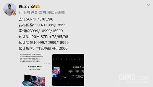 CNMO获悉,华为智慧屏S7 Pro预计将推出78、85和98英寸三个版本,预计实销价分别为10999元、12999元和18999元。作为对比,2025年3月发布的智慧屏S6 Pro,其75、85和98英寸的实售价分别为8999元、10999元和16999元。这意味着在同尺寸区间(75英寸对比78英寸),新品价格上浮了2000元。