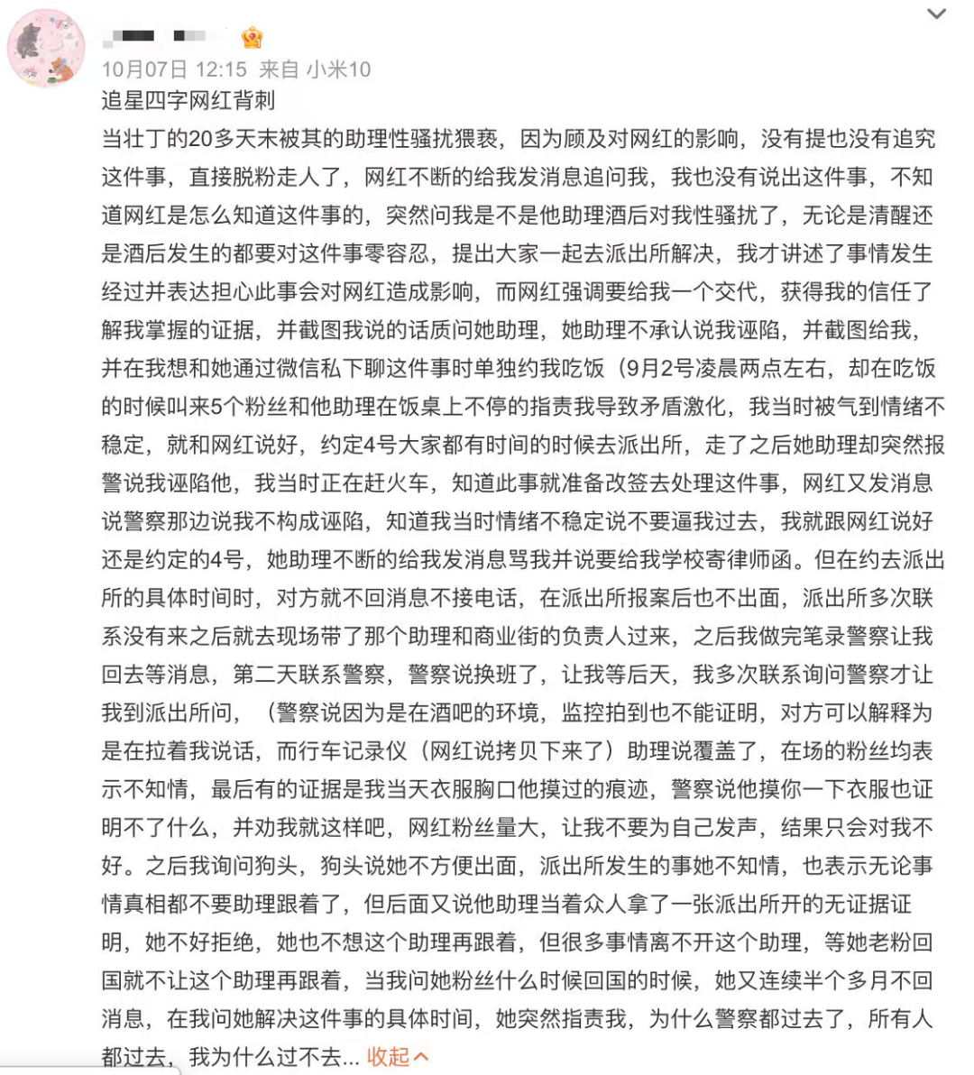 只说自己无意占用公共资源,没有任何对男助理的追责,也没有对受害女粉丝的一句安抚和歉意。