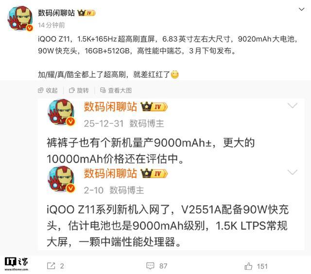 IT之家 3 月 9 日消息,博主 @数码闲聊站 发文,透露 iQOO Z11 将于本月下旬发布,该机搭载一块约 6.83 英寸大尺寸 1.5K 165Hz 超高刷直屏,搭载“高性能中端芯”,匹配 16GB RAM 和 512GB 存储空间,内置 9020mAh 大电池手机股票配资app,配 90W 快充头。